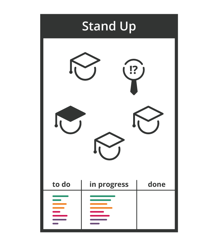 (Damit die eduScrum Teams die Methode in einem geschützten Raum und mit der Möglichkeit von Unterstützung einüben und verinnerlichen können, ist die Lehrperson bei den Stand Ups während des erstens Sprints zugegen).