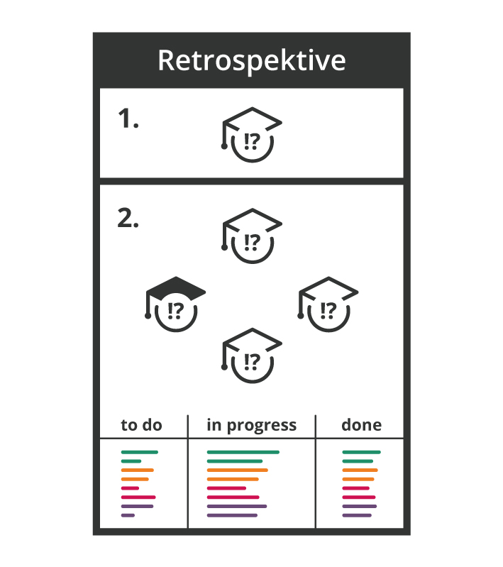 Sie beantworten unmittelbar nach dem Abschluss eines jeden Sprints (Veröffentlichung des Sprintergebnisses in ILIAS) zunächst die vier Fragen aus dem eduScrum Ereignis "Sprint Retrospektive" und dokumentieren die Antworten in der Portfoliovorlage.