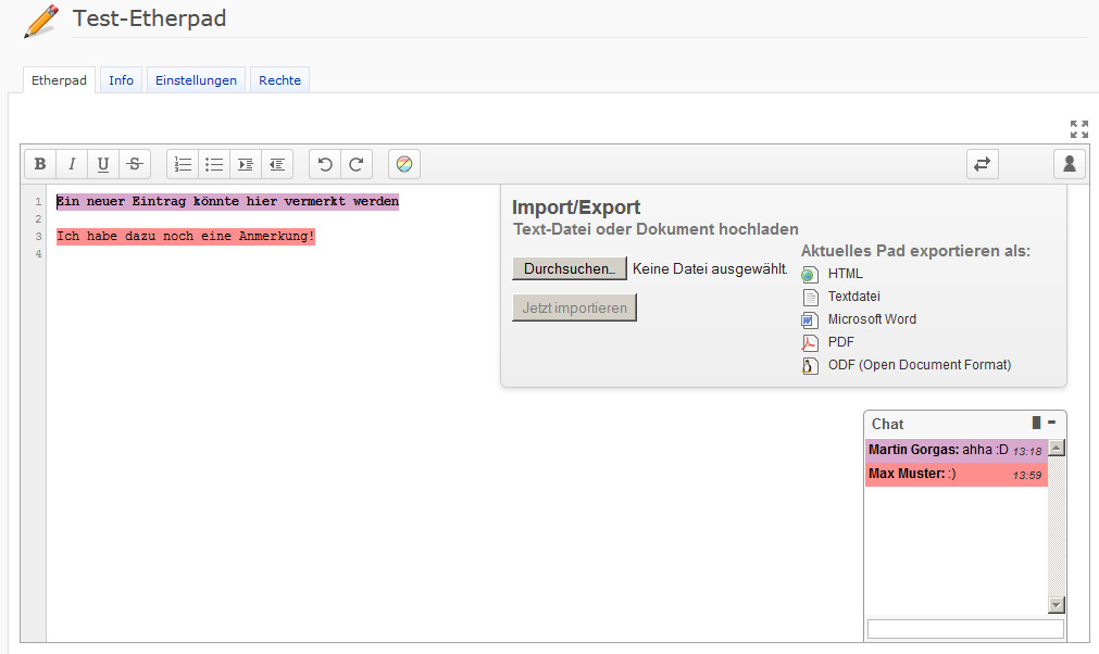 Durch das Etherpad wird eine zeitgleiche Texterstellung von mehreren Personen möglich, wobei jede Eingabe oder Änderung direkt bei allen Teilnehmern sichtbar wird. Damit nachvollziehbar bleibt, wer was geschrieben hat, wird den verschiedenen Autoren eine unterschiedliche Textfarbe zugewiesen. Diese farbigen Markierungen könnt Ihr nach Fertigstellung des gemeinsam erarbeiteten Textes natürlich auch wieder entfernen. Eine Übersicht über die verbunden Personen und deren Textfarbe erleichtert die gemeinsame Arbeit. Falls Fragen der Autoren untereinander unabhängig vom Textdokument geklärt werden sollen, ist dies über die ebenfalls integrierte Chatfunktion möglich. Am Schluss kann das erstelle Dokument in den gängigen Formaten hmtl, text, doc, pdf abgespeichert werden.