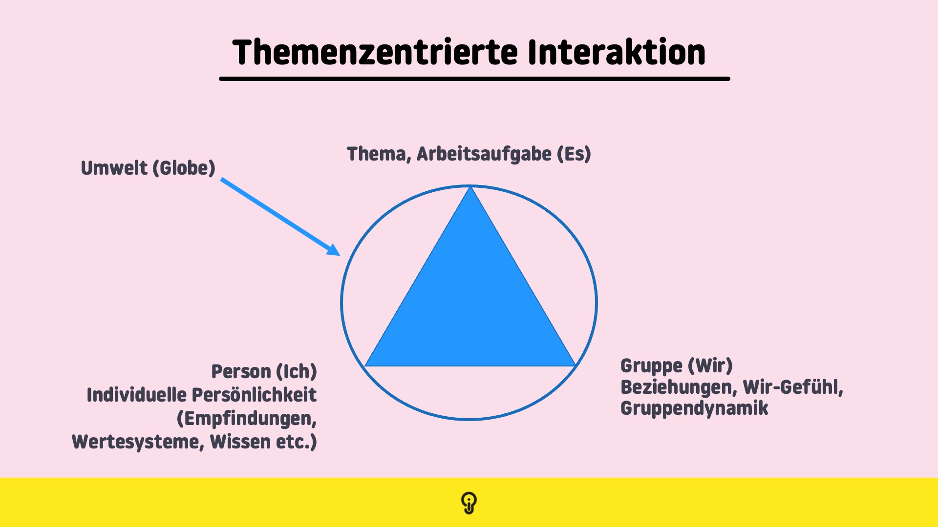Für eine möglichst gute Arbeit in einer Gruppe sollten sich die Bereiche Thema (Es), die einzelne Person (Ich) und die Gruppe (Wir) in einer dynamischen Balance befinden. D.h. im Verlauf der Arbeit kann und wird es zu einem Ausschlag in eine der drei Ecken kommen oder der Einfluss der Umwelt kann sich bemerkbar machen: eine Person ist unausgeschlafen zwei hatten in der letzten Pause Streit, das Thema ist zu kompliziert, der Raum zu warm etc. Diese "Störungen" müssen zunächst bearbeitet werden, damit die Gruppe arbeitsfähig bleibt oder wieder arbeitsfähig wird.