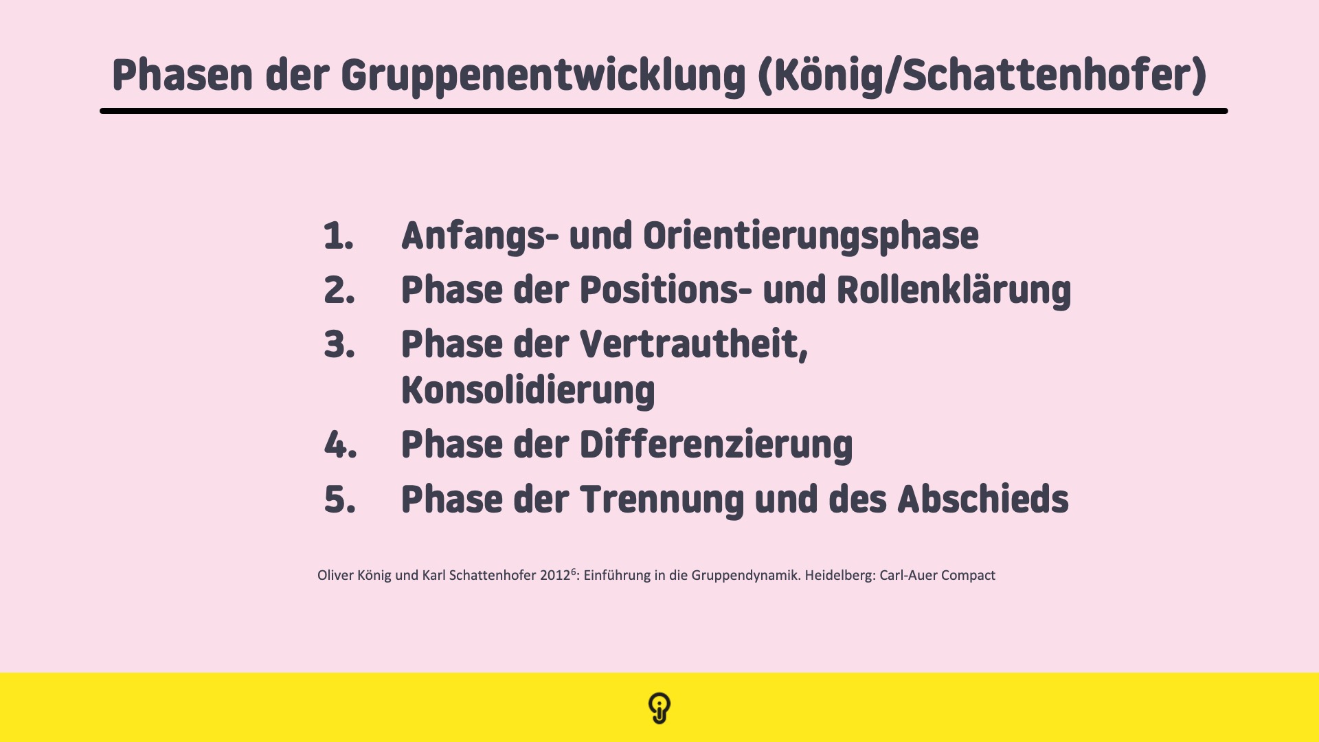 In Hinblick auf die Prozesse, die eine Gruppe in der Regel durchläuft, werden in der Literatur häufig fünf Phasen beschrieben - teils mit abweichenden Benennungen.
