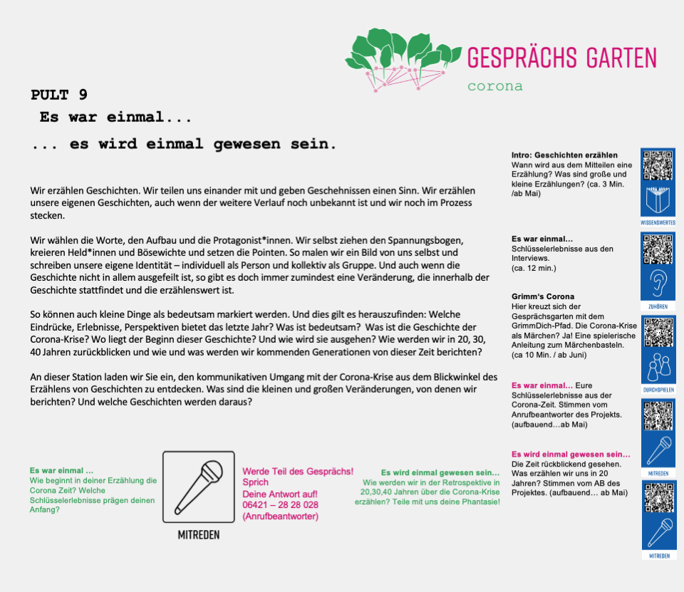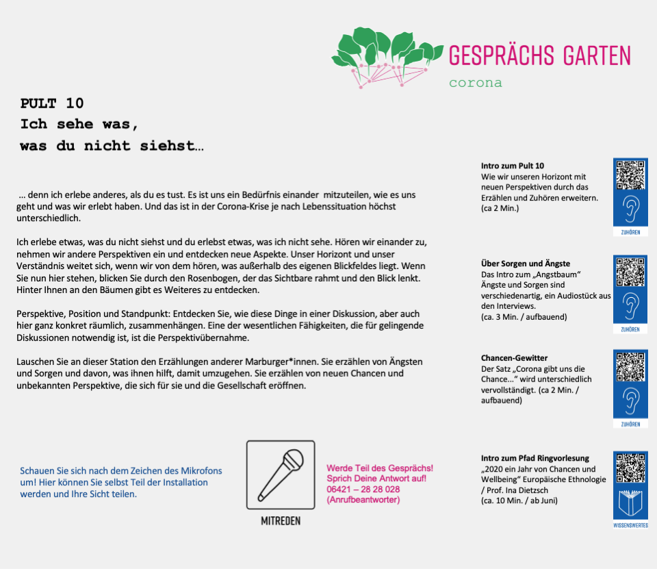 Unter dem Titel „Es war einmal ...es wird einmal gewesen sein“ sind an Pult 9 Episoden von Marburger*innen aus dem letzten Jahr zu hören, Pult 10 lädt unter dem Titel „Ich sehe was, was Du nicht siehst“ ein, zuzuhören, wie andere die Corona-Krise wahrnehmen. Sie finden in diesem Bereich auch Gelegenheit Ihre Geschichte zu erzählen.