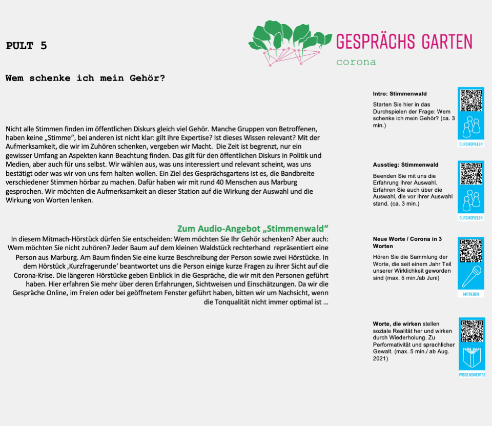 Pult 5 behandelt die Frage „Wem Gehör schenken?“ – denn wir schreiben Macht auch durch Anerkennung im Zuhören zu.