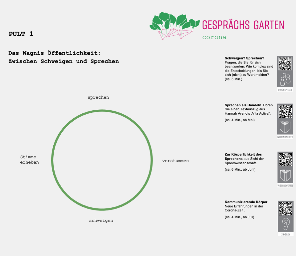 Pult 1 reflektiert allgemein „Das Wagnis Öffentlichkeit: zwischen Schweigen und Sprechen“.