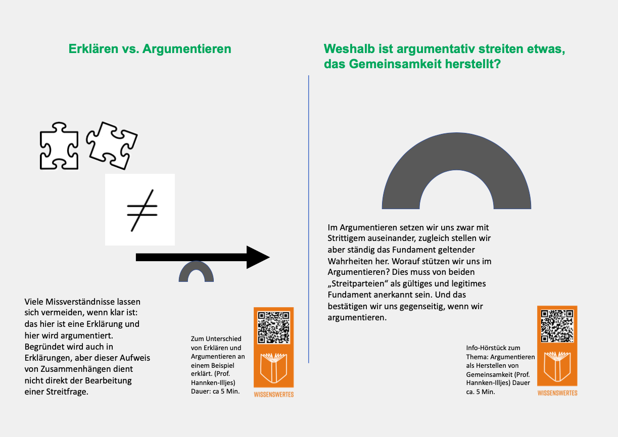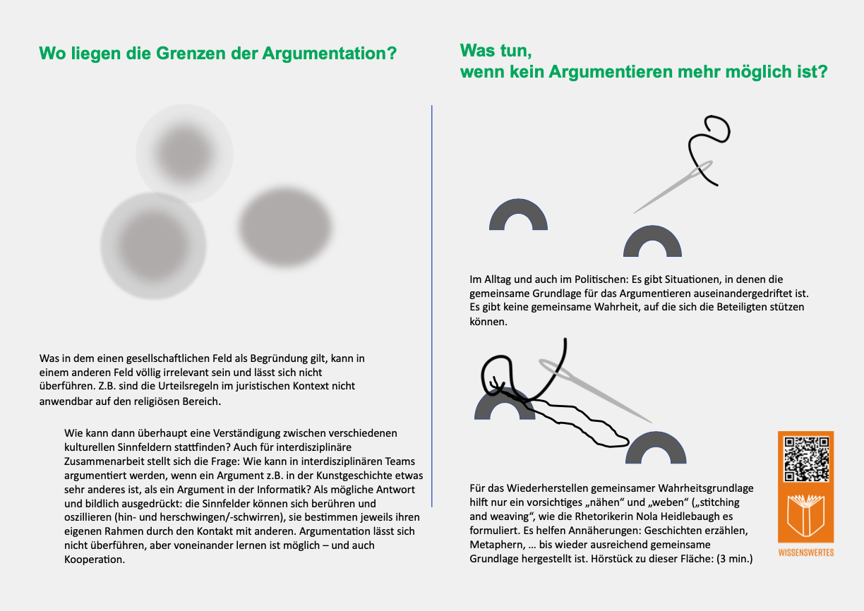 Argumentieren ist ein zentrales Mittel, um im gesellschaftlichen Miteinander zu Positionierungen und zu Entscheidungen zu kommen. Doch das ist nicht leicht: Zunächst sind konkrete Streitfragen zu identifizieren, die dann einer Pro- und Contra-Argumentation gestellt werden. Debatten werden schnell sehr komplex. Zudem ist Argumentation eines gesellschaftlichen Bereiches (z.B. Recht) nicht in einen anderen Bereich (z.B. Religion) überführbar. Dennoch: Eine Entscheidung muss begründbar sein und die Gründe müssen geprüft und abgewogen werden können. Grundlage dafür ist ein common ground, eine gemeinsame Basis, die vielleicht auch im Gespräch selbst entsteht.