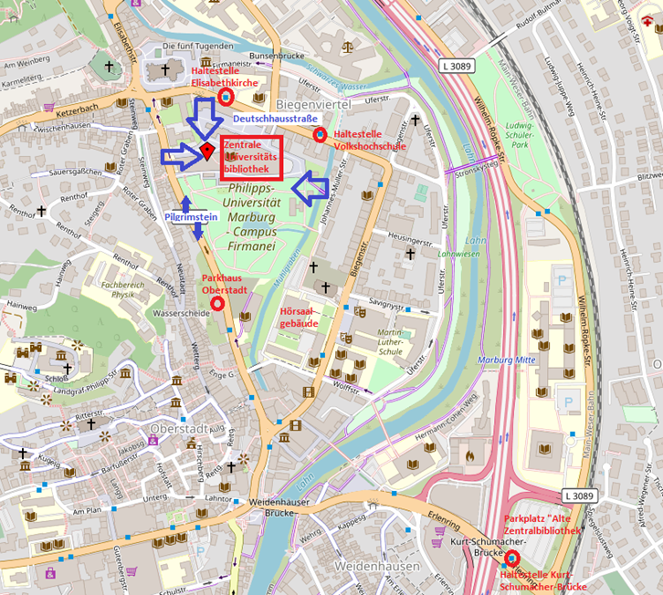Die Veranstaltung findet in der neuen Universitätsbibliothek (Deutschhausstraße 9) statt. Diese ist von verschiedenen Seitenzugänglich, der Hauptzugang erfolgt über die Deutschhausstraße. Die UB befindet sich hinter den Gebäuden an der Deutschhausstraße, der Zugang zu Fuß ist bei den Hausnummern 2-3 möglich.