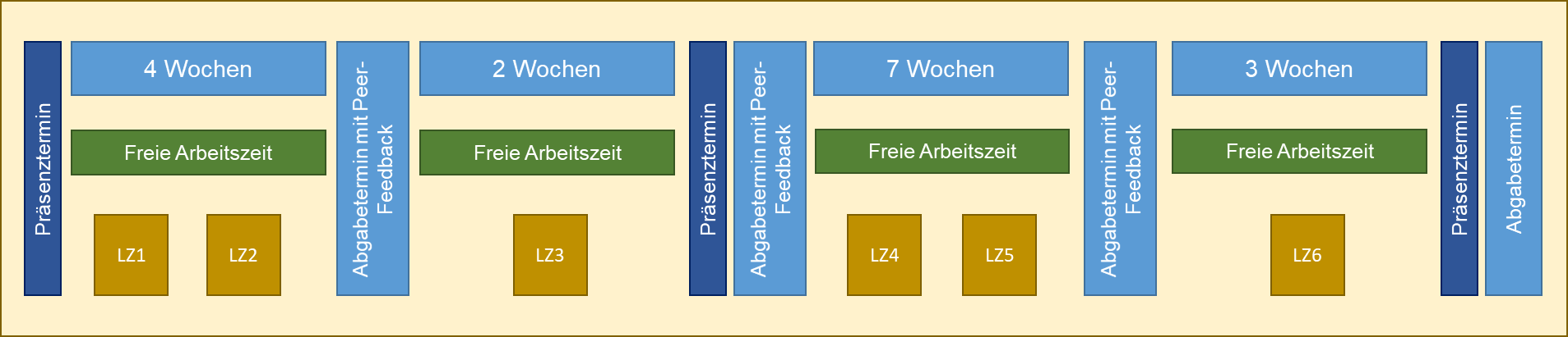 Zur ersten Abgabefrist nach 4 Wochen sollten Lernziele eins und zwei absolviert werden. Für das dritte Lernziel hatten die Studierenden weitere zwei Wochen Zeit bis zum zweiten Präsenztermin. Nach weiteren 7 Wochen sollten mit Abgabe der dritten Feedbackübung Lernziele vier und fünf abgeschlossen werden, bis schließlich zur Bearbeitung des letzten Lernziels eine drei weitere Wochen bis zum Abschluss eingeplant wurden.