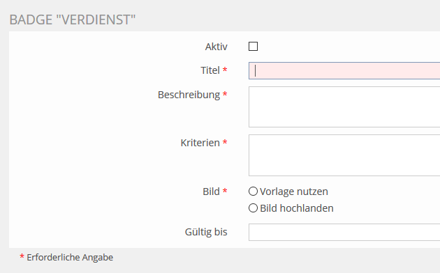 Gültig bis: Die Gültigkeit eines Badges kann zeitlich limitiert sein. Falls dies erwünscht ist, geben Sie hier das Gültigkeitsdatum ein. Das Badge wird allerdings nicht entzogen, und es handelt sich um eine textliche Information, z.B. "[Helfende Hand beim Aufbau] Sommersemester 2019".