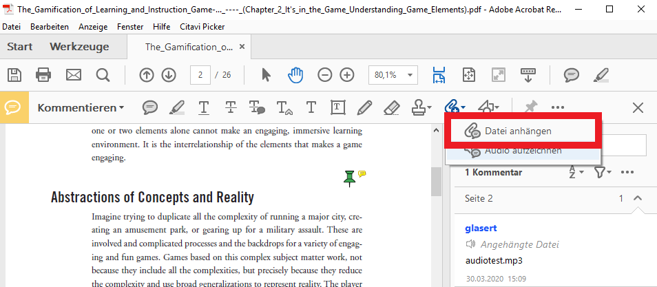 Mit dem Acrobat Reader können Sie auch Audiokommentare in Ihren PDFs hinzufügen. Wählen Sie dazu unter Anzeige/Werkzeuge/Kommentieren.