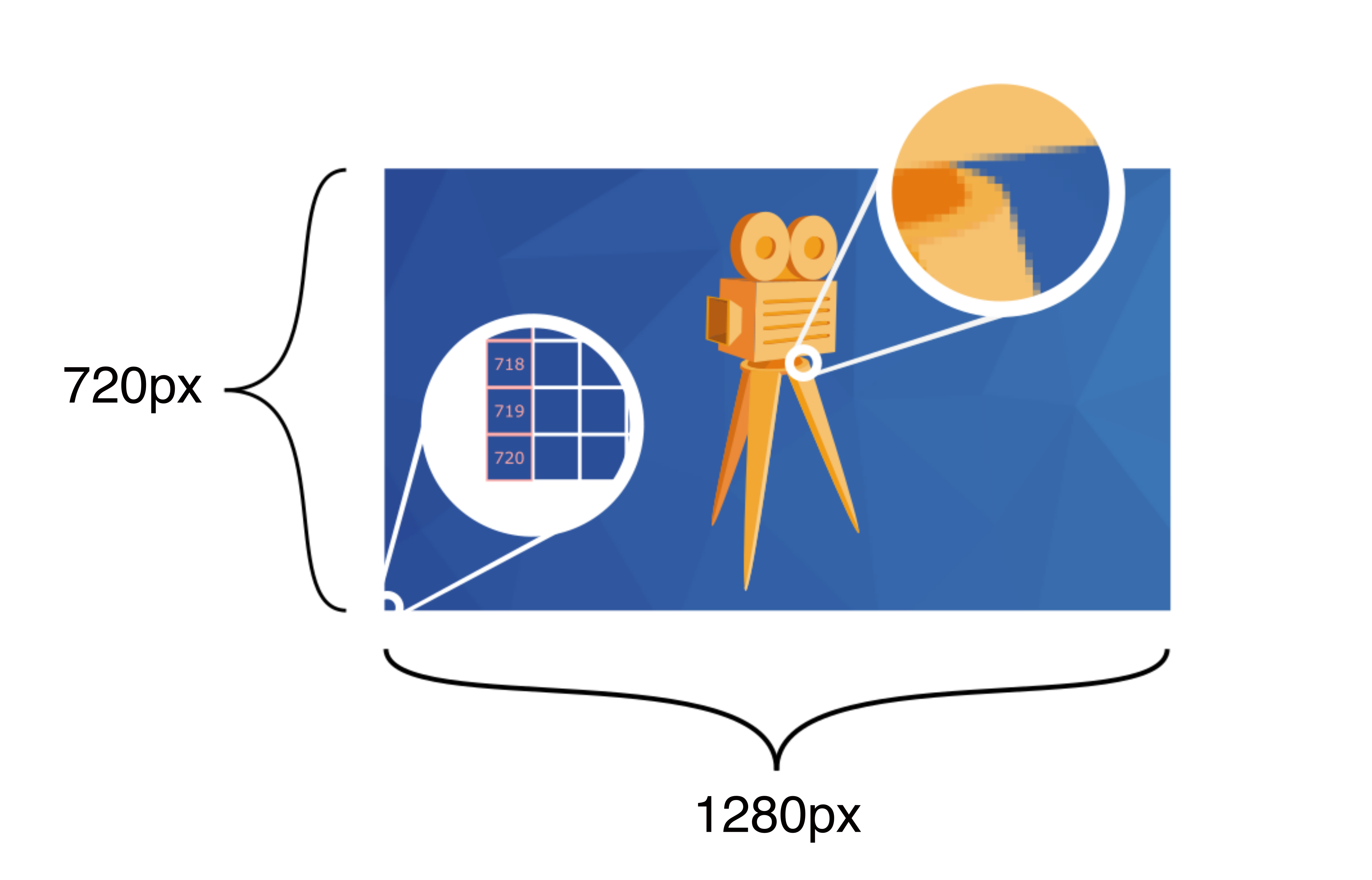 Because each image consists of several hundred thousand pixels, our eyes only perceive the objects that are formed by the pixels. The number of pixels in an image is indicated by the resolution. Since it is irrelevant to specify the total number of pixels, only the number of pixels needed to get from one edge of the image to the other on the short side is specified. For example, the resolution specification "720p" means 720 pixels in the vertical direction. However, the number of pixels on the long and short sides are also often specified. With "720p" it is then: 1280x720 pixels.