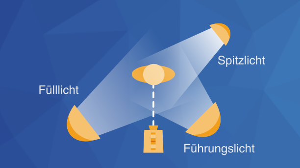 When it comes to artificial light, 3-point lighting is the best known. It consists of 3 lamps: the leading light, the fill light and the highlight. When this type of lighting is used, the camera is positioned exactly in front of the subject.