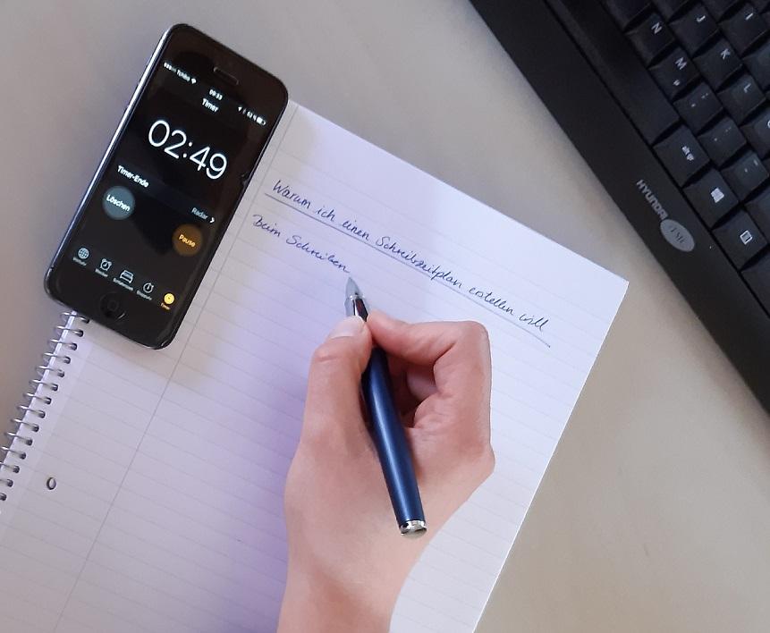 Schreiben Sie über das Thema „Warum ich einen Schreibzeitplan erstellen will“. Schreiben Sie einfach drauf los, ohne zu überlegen, ohne abzusetzen und ohne auf Fehler zu achten oder Ihre Gedanken zu zensieren. Sie sind völlig frei, denn der Text ist nur für Ihre Augen bestimmt.