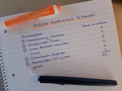 Eine Gesamtübersicht enthält Angaben zu den anfallenden Aufgaben und zur Dauer der Arbeitsphasen. Sie kann zum Beispiel nur fünf oder sechs Arbeitsphasen abbilden und Ihnen so eine grobe zeitliche Orientierung zu bieten oder Sie können sehr detailliert Arbeitsschritte auflisten und ganz genau planen. Prüfen Sie für sich, womit Sie gut zurechtkommen. Auf dem Foto sehen Sie ein Beispiel für eine Masterarbeit mit sechsmonatiger Bearbeitungszeit.
