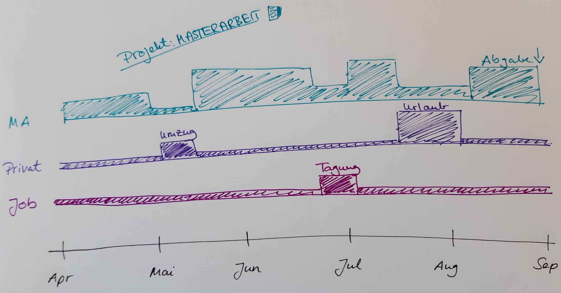 Es gibt Schreibende, denen die Arbeit mit Tabellen nicht liegt, weil Sie z.B. eher visuelle Lerntypen sind oder weil Sie sich von detaillierten Plänen unter Druck gesetzt fühlen. Für sie eignen sich bildliche Darstellungen eines Zeitplans wie der Zeitstrahl. Hier können Sie verschiedene Lebensbereiche nebeneinanderstellen und markieren, wann sie wo viel Zeit investieren müssen oder können. Eine Anleitung zum Zeitstrahl finden Sie in Ulrike Scheuermanns hilfreichem Ratgeber Die Schreibfitness-Mappe (S. 66-67).