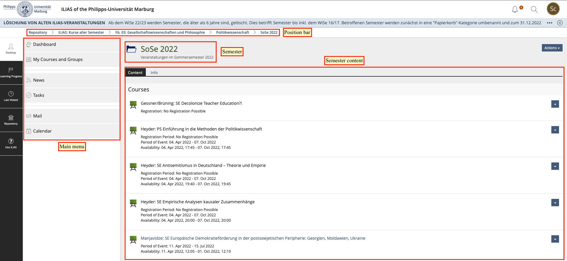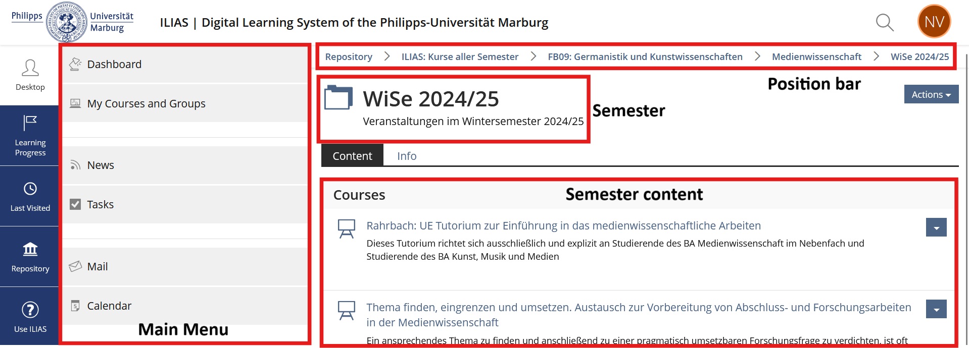 All offers (semester apparatuses, online courses, etc.) can be accessed via the magazine. The magazine is arranged hierarchically. The departments and non-departmental facilities are at the top level. Clicking on a department takes you down one level. Here you will find all the institutes of the respective department. Click on one of the institutes to open its course offerings for the last three semesters. Click on the name of an offer to call it up. By clicking on the button Actions and clicking again on the option On your desk, you can put a course offer on your personal desk.