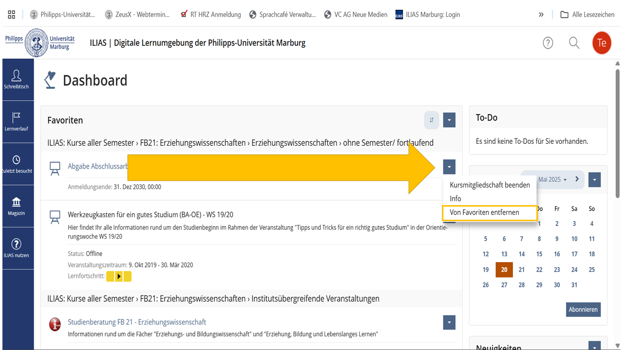 Im aufgeklappten Menü klicken Sie auf "Von Favoriten entfernen", um den Kurs nicht mehr auf dem Dashboard anzuzeigen.