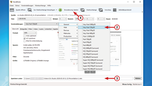 - Wählen Sie die Voreinstellung: General - Very Fast 720p30