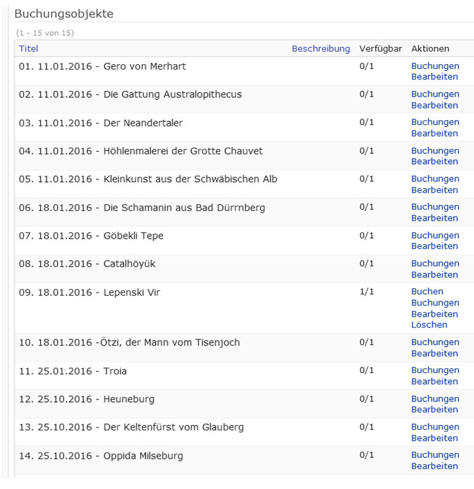 Nachdem Ihr alle Themen eingepflegt und den Buchungspool online gestellt habt, sehen die Studiereden eine Liste. Über den Punkt „Buchen“ können sie das Thema auswählen. Falls einige Personen das Referat nicht mehr möchten, können sie sich über „Stornieren“ wieder austragen. Als Dozent erhaltet Ihr einen Überblick über die Zuordnung über den Punkt „Buchungen“.