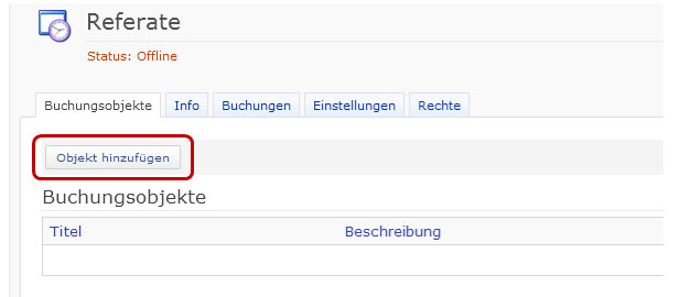 Im Reiter „Buchungsobjekte“ könnt Ihr über „Objekte hinzufügen“ nun die Referatsthemen inklusive Datum einpflegen. Eine kurze Beschreibung hilft den Studierenden, sich etwas unter dem Thema vorzustellen. Im Pflichtfeld „Anzahl“ müsst Ihr festlegen, wie viele Personen an diesem Referat beteiligt sein sollen.