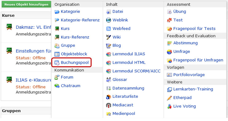 Heute möchte ich Euch zeigen, wir Ihr mittels ILIAS Referate verwalten könnt. Während des Semesters müssen viele Entscheidungen getroffen werden, welche zwischen den Präsenzveranstaltungen stattfinden. Dazu gehört sicherlich die Verteilung von seminargebundenen Referatsthemen über den klassischen Aushang am schwarzen Brett des Fachbereichs. Um das Verfahren computergestützt abzubilden und somit auch Studierenden außerhalb der Universität die Wahl der Referate zu ermöglichen, bietet sich das ILIAS-Objekt Buchungspool an.
