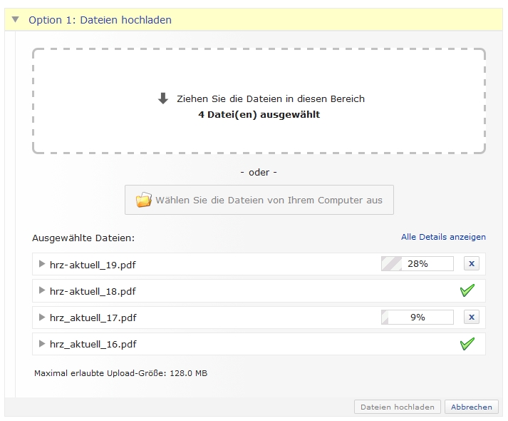 Hochladen: Mehrere Dateien lassen sich jetzt bequem per Drag & Drop oder per Dateiauswahl im Dialogfenster hochladen. Der Umweg über ein zuvor erstelltes ZIP-Archiv entfällt damit.