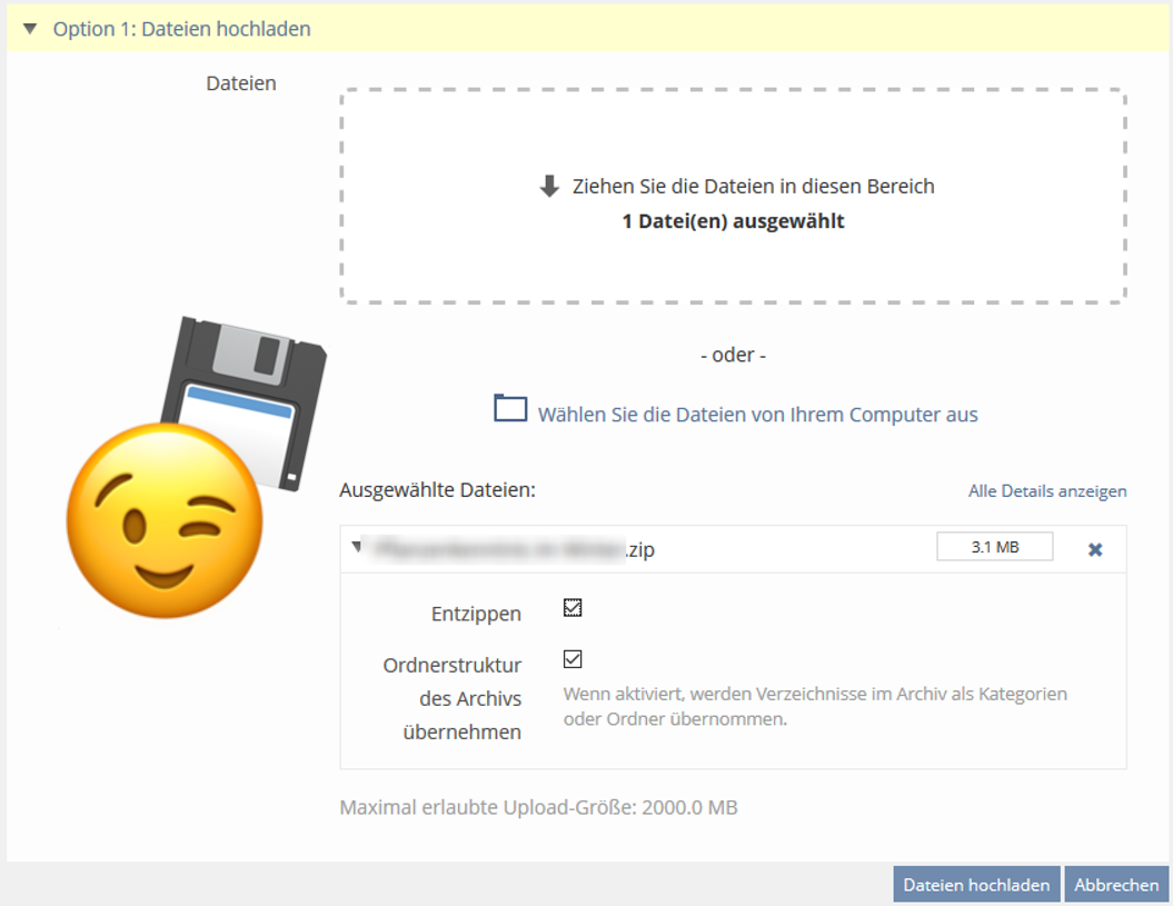 ![]() Hochladen von Dateien inkl. Ordnerstruktur via Zip-Archiv. |