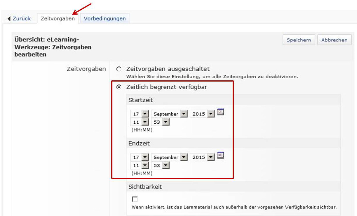 Über die zeitbezogene Verfügbarkeit könnt ihr ein Objekt erst ab einem bestimmten Zeitpunkt freigeben, beispielsweise Vorlesungsskripte nach der Veranstaltung. Dazu legt Ihr unter Zeitvorgaben den Zeitraum (Datum und Uhrzeit) fest. Über den Punkt Sichtbarkeit kann definiert werden, ob das Objekt auch außerhalb des gewählten Zeitraums sichtbar sein soll.