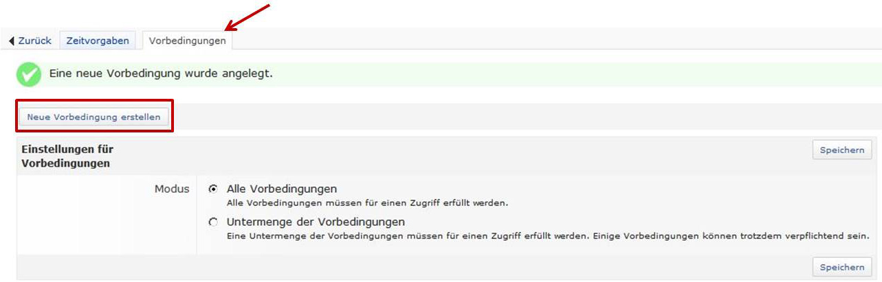 Hierüber können Abhängigkeiten zwischen Objekten geschaffen werden. So kann beispielsweise festgelegt werden, dass neue Lernmaterialien erst nach dem Absolvieren eines kleinen Tests für den jeweiligen Kursteilnehmer zugänglich werden. Um derartige Vorbedingungen einzustellen, klickt auf den entsprechenden Reiter und danach auf die Schaltfläche Neue Vorbedingung erstellen. Danach gelangt Ihr in eine Übersicht des Magazins, in der alle relevanten Inhalte aufgelistet werden. Wählt hier das gewünschte Objekt aus und legt im nächsten Schritt die verlangte Bedingung, beispielswiese bestanden oder beendet, aus.