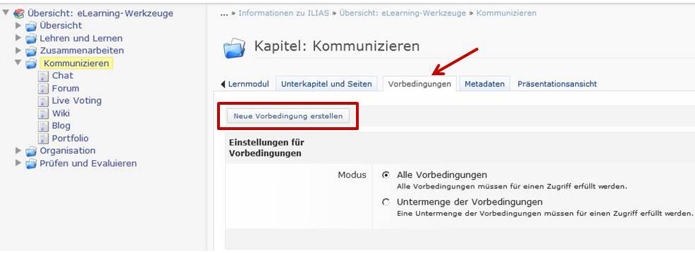 Auch innerhalb von Lernmodulen kann mit Vorbedingungen gearbeitet werden. So ist es beispielsweise möglich, zu definieren, dass der Zugriff auf das nächste Kapitel erst nach der vorherigen Bearbeitung eines Tests erlaubt ist. Die Voraussetzung kann im Bearbeitungsmodus eines Kapitels unter Vorbedingung festgelegt werden. Tests (bestanden, beendet, nicht beendet), Umfragen (beendet) und Übung (bestanden) können als Bedingung definiert werden.