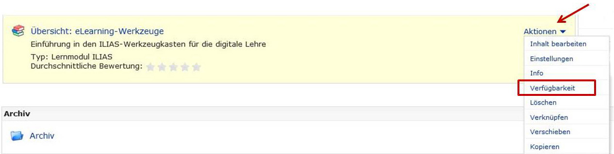 Ein Großteil, der bei ILIAS eingestellten Lernmaterialen, steht jedem Kurs-Mitglied standardmäßig sofort zur Verfügung. Um bestimmte didaktische Szenarien umzusetzen oder einfach nur den Kurs in Ruhe vorzubereiten, könnt Ihr mit automatisch gesteuerten Verfügbarkeiten arbeiten. Man kann die Verfügbarkeit entweder durch Zeitvorgaben steuern als auch durch ergebnisbezogene Vorbedingungen. Beide Einstellungen könnt Ihr über das Aktionsmenü unter Verfügbarkeit vornehmen.