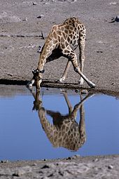 Giraffen beweiden bevorzugt Baumkronen, mit Vorliebe Akazien. Dabei greifen die Tiere einen Zweig mit ihrer Zunge, ziehen ihn ins Maul und streifen durch Zurückziehen des Kopfes die Blätter ab. Zunge und Lippen sind so beschaffen, dass sie trotz der dornigen Äste keinen Schaden nehmen. Jeden Tag nimmt eine Giraffe etwa 30 kg Nahrung auf; hierfür benötigt sie sechzehn bis zwanzig Stunden. Der Flüssigkeitsbedarf wird größtenteils aus der Nahrung gedeckt, so dass Giraffen wochenlang ohne zu trinken auskommen können. Wenn sie doch trinken, müssen sie die Vorderbeine weit spreizen, um den Kopf weit genug zur Wasserquelle herabsenken zu können; ebenso verfahren sie, wenn sie Nahrung vom Boden aufnehmen, was sie allerdings nur unter sehr ungünstigen Umständen tun.[2]