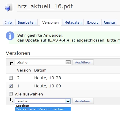 Versionsverwaltung: Über das Aktionen-Menü einer Datei ("Inhalt bearbeiten") lassen sich neue Versionen einer Datei hochladen, wobei die alten Versionsstände beibehalten werden. Die verschiedenen Versionen können jetzt in der Versionsverwaltung (Aktionen-Menü: "Versionen") komfortabler verwaltet werden.