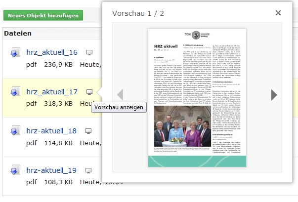 Vorschau: Beim Hochladen wird für Bild- sowie PDF-Dateien eine Vorschau erzeugt, in der auch geblättert werden kann. (Für bereits in ILIAS hochgeladene Dateien wird die Vorschau beim ersten Klick auf das Vorschau-Symbol nachträglich erzeugt.)