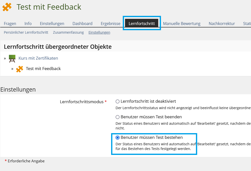 Das Zertifikat wird entsprechend der im Test hinterlegten Erfassung des Lernfortschritts vergeben - zur Auswahl stehen das Beenden oder Bestehen des Tests.