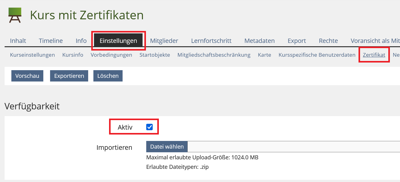 In Kursen kann unter dem Reiter "Einstellungen" der Unterpunkt "Zertifikat" aufgerufen werden, um ein Zertifikat zu erstellen.
