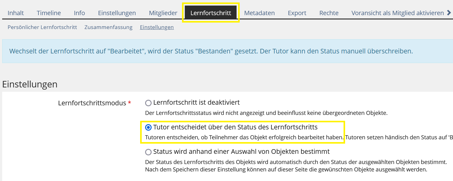 Rufen Sie nun den Reiter "Lernfortschritt" im Kurs auf. Hier können Sie wählen, wie dieser erfasst werden soll.