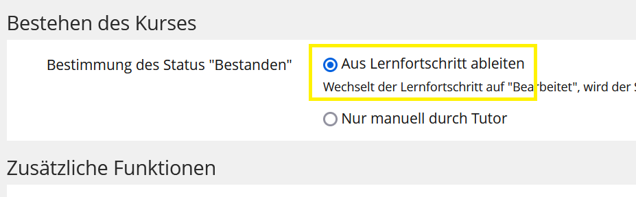 Unter dem Reiter "Einstellungen" im Kurs muss für "Bestehen des Kurses" die Option "Aus Lernfortschritt ableiten" ausgewählt sein: