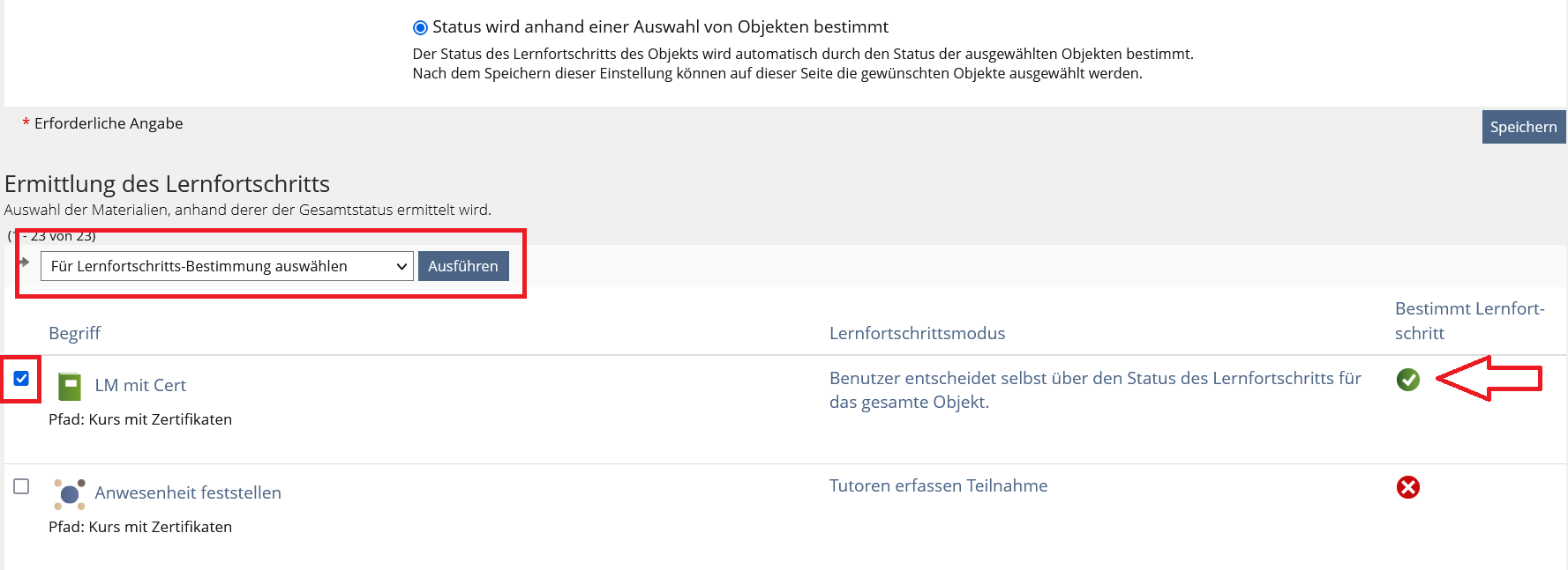 - Weiter unten können Sie auswählen, welche der Objekte im Kurs dafür ausgewertet werden sollen. Markieren Sie sie mit einem Haken, wählen "Im Lernfortschritt zeigen" aus, und gehen auf "Ausführen.