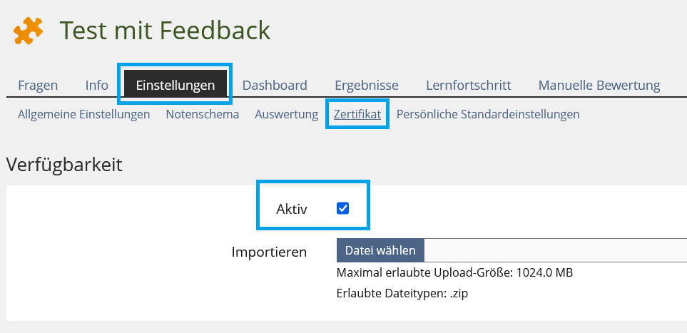 - Bei Aktiv muss das Häkchen gesetzt sein, um das Zertifikat für Kursteilnehmerinnen und Teilnehmer zugänglich zu machen.