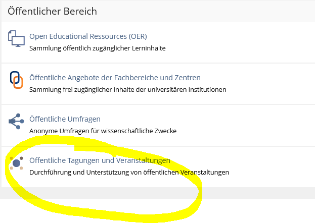 - Öffentliche Tagungen können nun ebenso im zentralen ILIAS liegen: Öffentliche Tagungen und Veranstaltungen