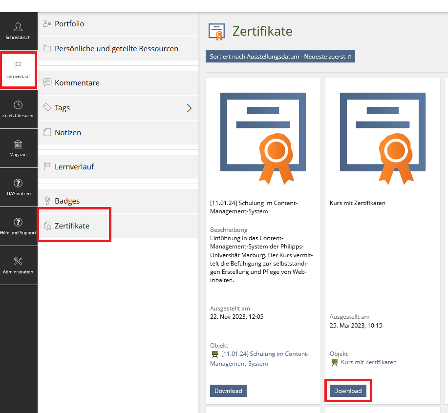 Zertifikate liegen in ILIAS gesammelt am selben Ort: In der linken Hauptnavigation befindet sich der 2. Punkt Lernverlauf, der sich durch Anklicken aufklappen lässt, und den Unterpunkt Zertifikate enthält.