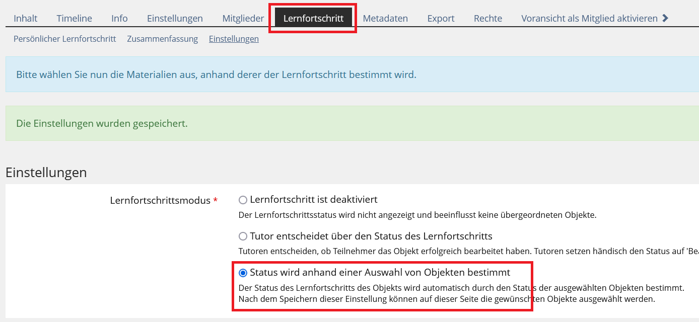 - Wählen Sie "Lernfortschritt wird an ausgewählten Objekten erfasst" aus.