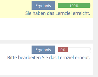 - Wenn Sie den Abschlusstest bestehen, erhalten Sie in der Lernzielnavigation ein optisches Feedback dazu, ob Sie das Lernziel erreicht haben. Sofern Sie den Test bestanden haben, wird das Lernziel mit einem grünen Balken versehen (rechts oben im Lernzielreiter, vgl. Bild). Das hier angezeigte Ergebnis bezieht sich jedoch nur auf den Abschlusstest des jeweiligen Kapitels.