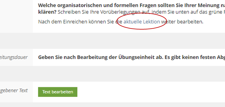 In manchen Kapiteln finden Sie Verlinkungen zu sogenannten Übungen. In diesen haben Sie die Aufgabe entweder Texte oder Dateien einzustellen. Nach Abschluss der Aufgabe können Sie zur richtigen Stelle im Selbstlernmodul gelangen, indem Sie dem jeweils in der Aufgabenstellung aufgeführten Link (siehe Bild) folgen.